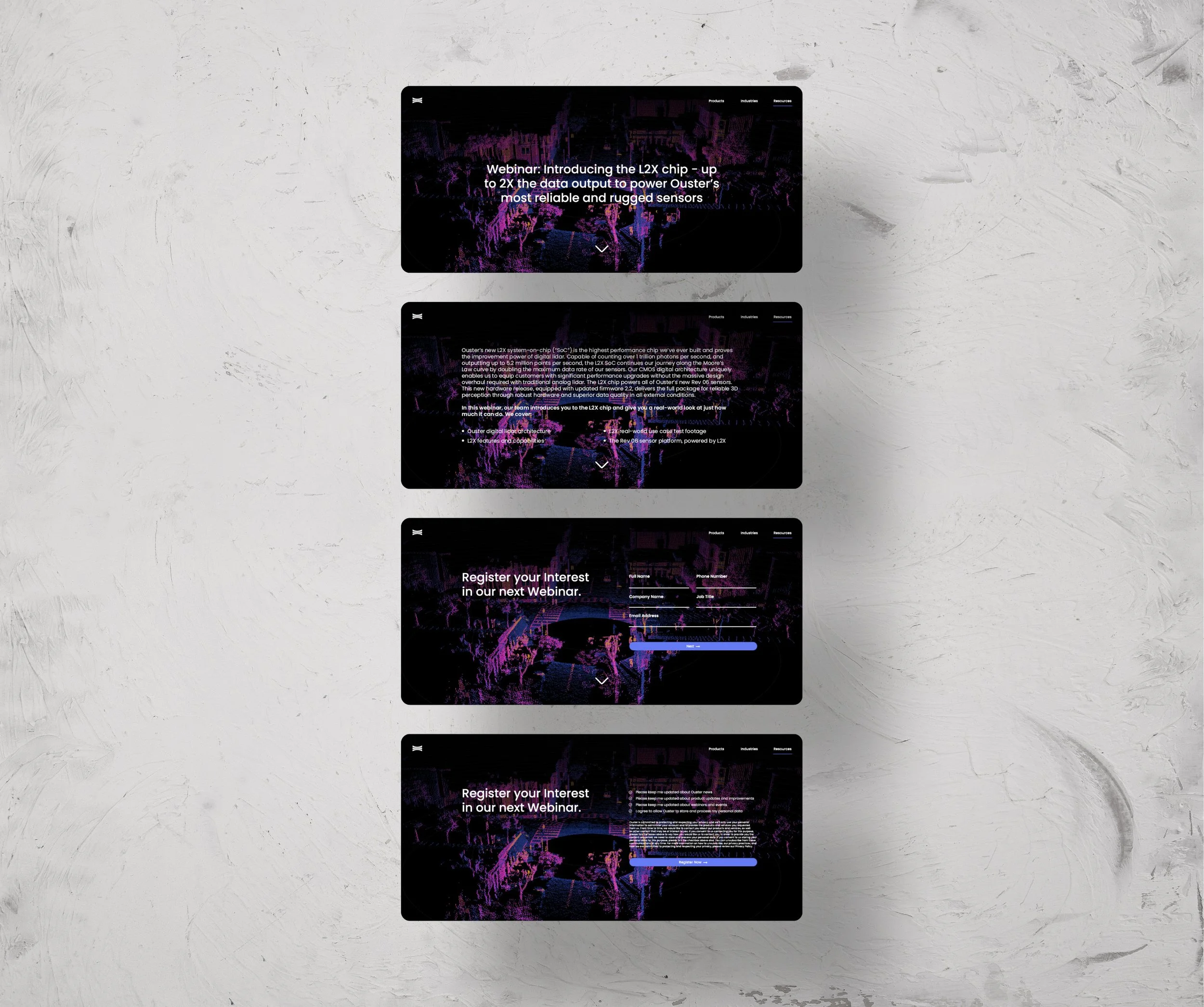 High Fidelity Mock ups and UI Design for the Ouster website build, as well as digital presentations for internal and external stakeholders.
